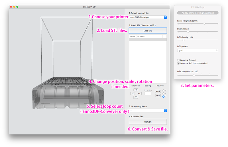 3D object have to be saved in STL file format. Launch anno3DP-DP application. 1. Choose 3Dprinter type you use. 2. Load STL files. 3. Set up paremeters. 4. If needed, change STL file's position, scale, rotation. 5. Choose the number of loop count of printing ( only in anno3DP-Conveyer ). 6. Name converted file and save the file. 7. Copy the file into SD card, insert it to 3DPrinter, choose file name to start printing. |