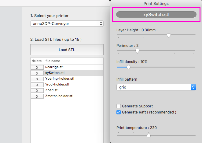 3. Set parameters for each STL file.(only in anno3DP-Conveyer)